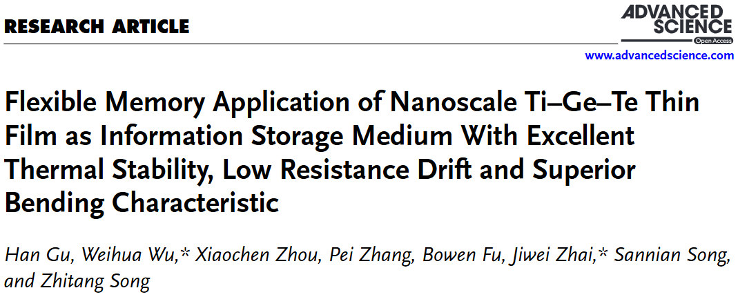 近日,我院半导体薄膜与器件研究团队在相变存储材料设计及器件应用领域取得新进展。相关研究成果以“Flexible Memory Application of Nanoscale Ti-Ge-Te Thin Film as Information Storage Medium with Excellent Thermal Stability, Low Resistance Drift and Superior Bending Characteristic”为题发表于国际一流期刊《Advanced Science》(中科院1区Top,JCR一区,IF=14.1)。
