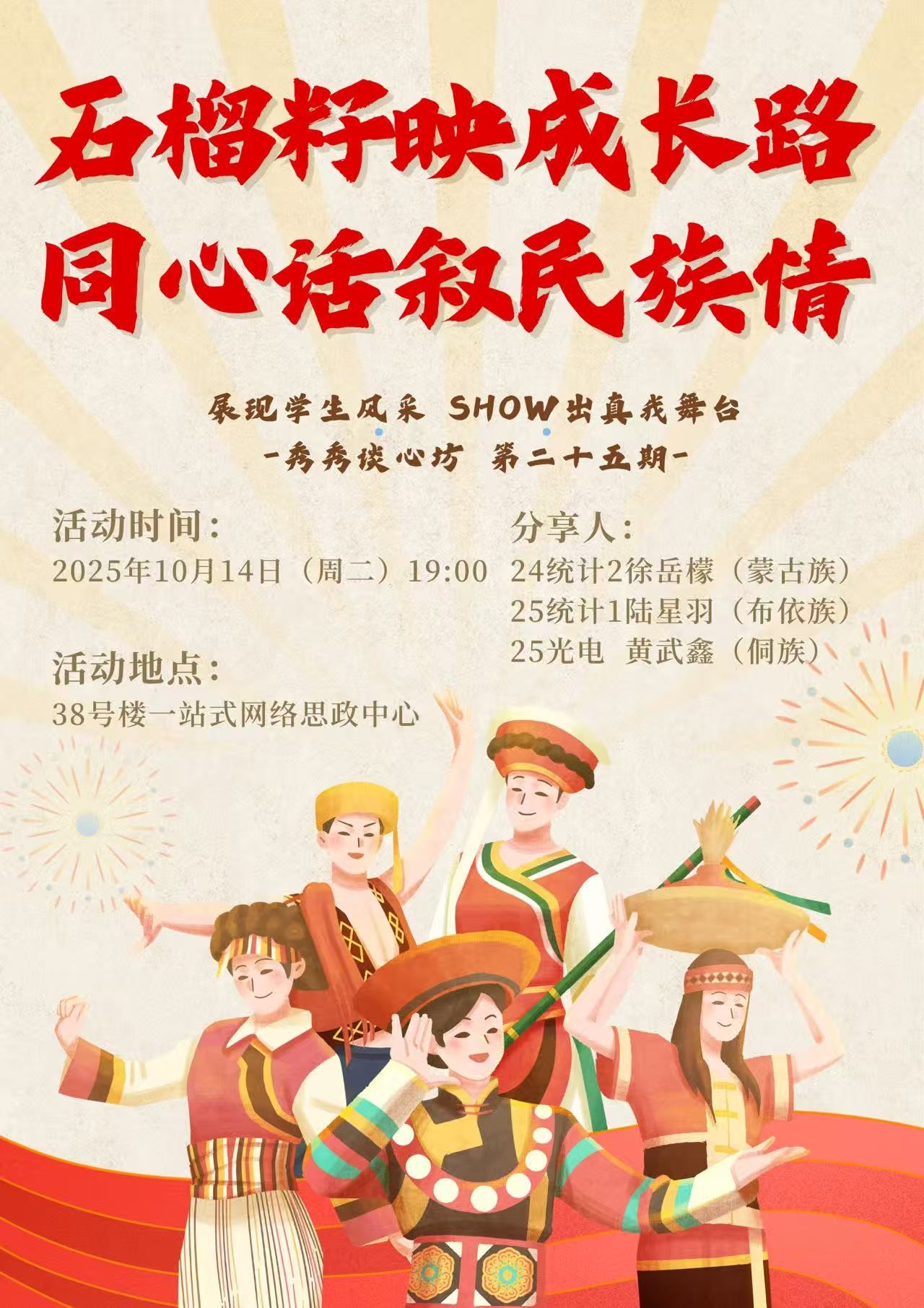 为深入学习贯彻习近平总书记关于加强和改进民族工作的重要思想,铸牢中华民族共同体意识,10月14日晚,秀秀谈心坊第二十五期“石榴籽映成长路,同心话叙民族情”主题活动在38号楼“一站式”社区网络思政中心成功举办。活动由蔡烨老师及秀秀谈心坊团队精心策划,24统计2班徐岳檬担任主持人,还特别邀请陈雪平院长与同学们面对面交流。