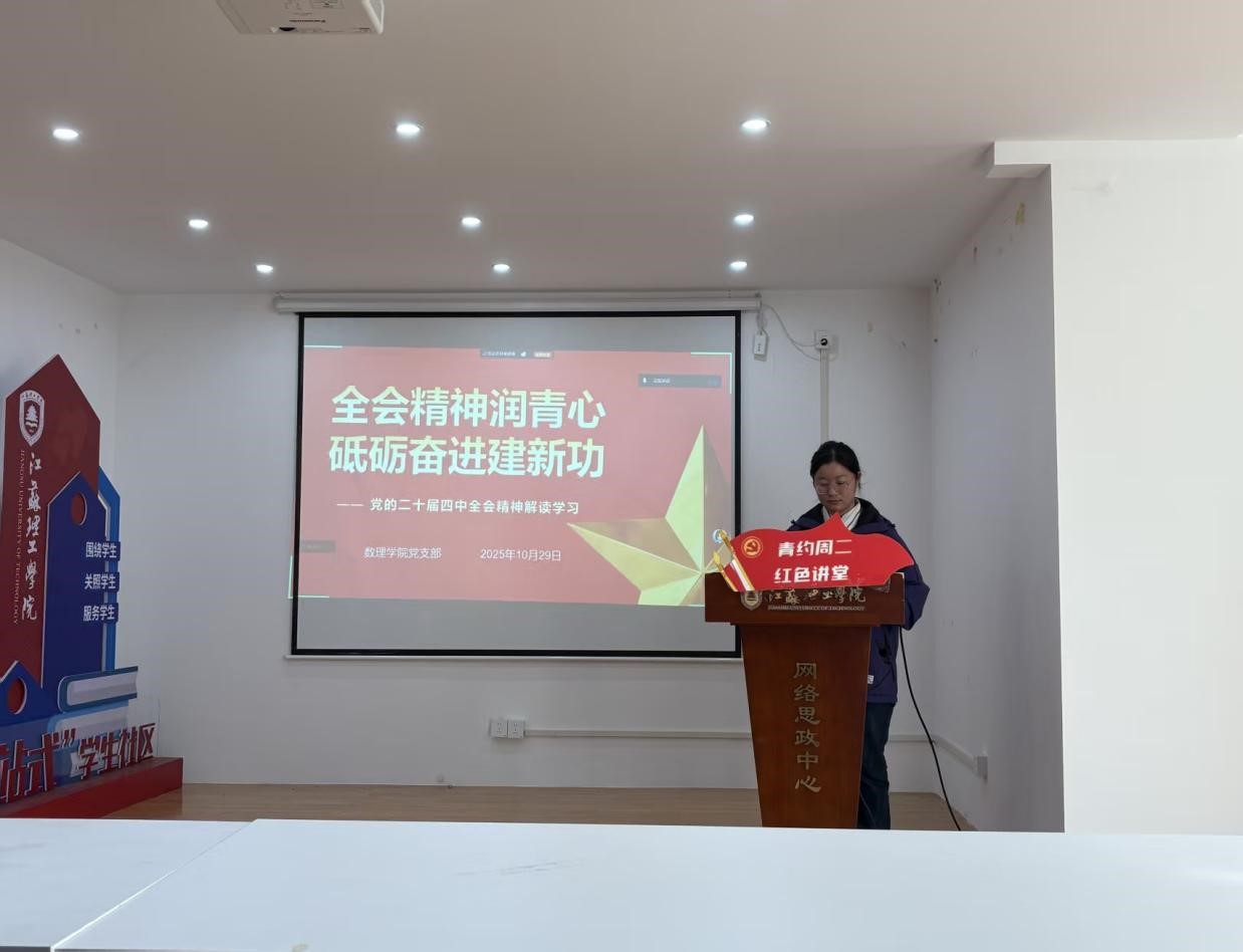 为深刻领会党的二十届四中全会精神,2025年10月29日,数理学院学生党支部在38号楼“一站式”社区网络思政中心开展“青约周二”暨书记上党课活动,分别以初心使命教育和二十届四中全会精神解读为核心,为入党积极分子与学生党员注入思想动力。