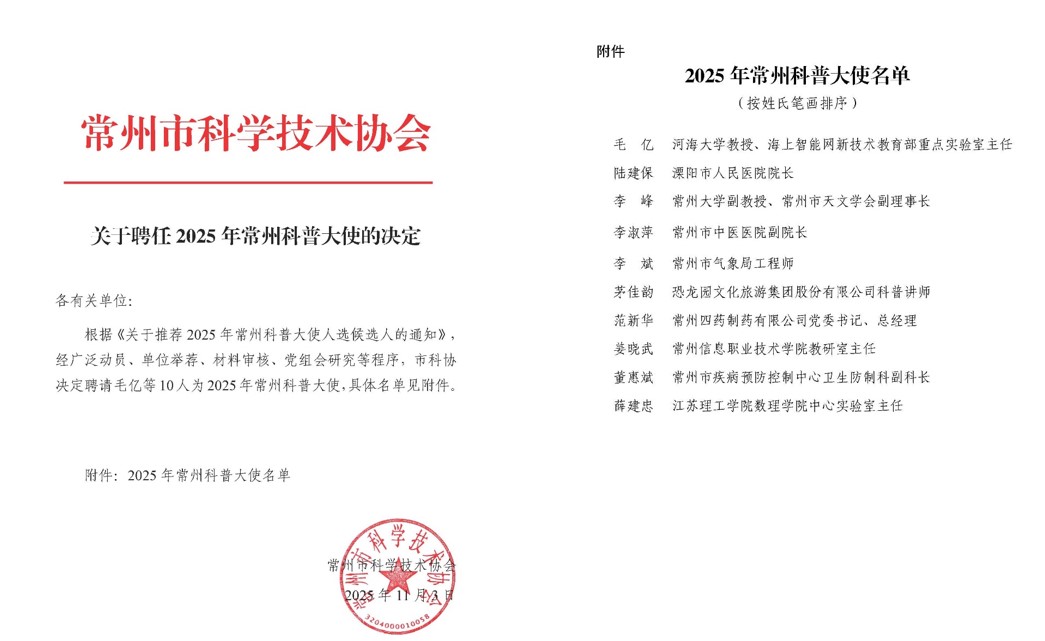 此次获聘 “常州市科普大使,是对薛老师过往科普工作的充分肯定,也是我院科普工作成效的重要体现,更是对其未来继续深耕科普事业的激励。(图/文 薛建忠;编辑/尚江伟;审核/季敏)