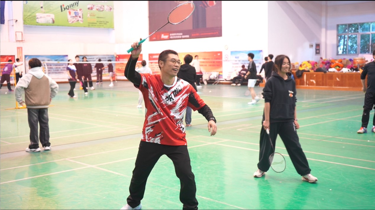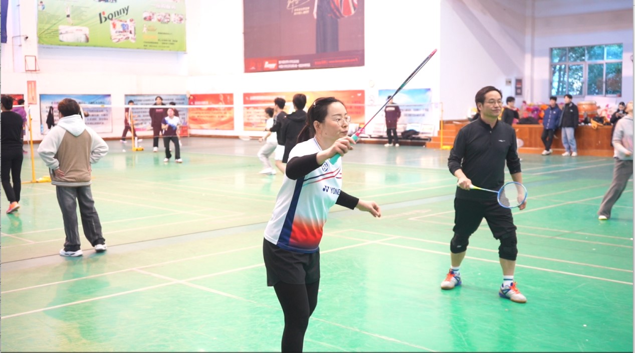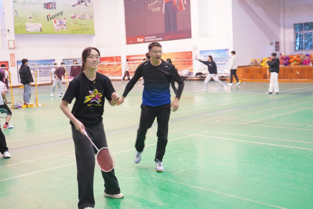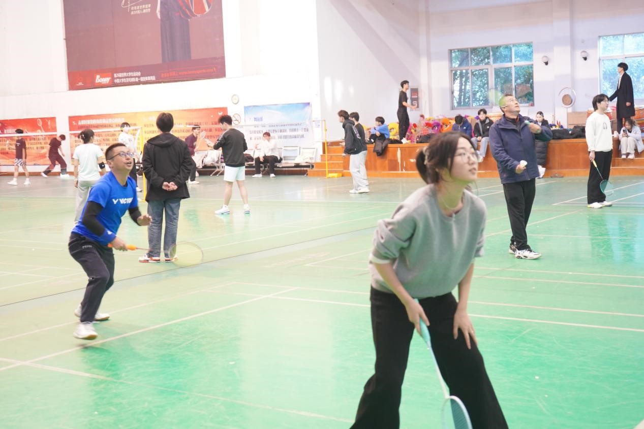 比赛分为红蓝两组,师生混合组队,以团队总分接力的形式进行。平日里三尺讲台的老师与勤学不辍的学子同场挥拍,高远球划出优美“抛物线”,网前轻吊暗含“精确计算”,巧妙配合更勾勒出默契的“同心圆”。比赛设置最佳拍档奖,薪火相传奖和青出于蓝奖。