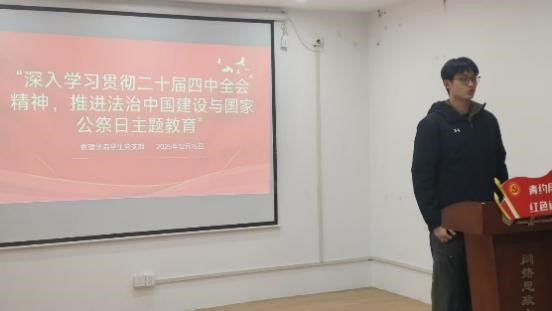 为深入学习贯彻党的二十届四中全会精神,推进法治中国建设,同时缅怀革命先烈、传承红色基因,数理学院学生党支部于20251213日在38号楼一站式学生社区网络思政中心开展系列主题教育宣讲活动,本次宣讲由徐子牧同志主讲,数理学院学生党员参与。