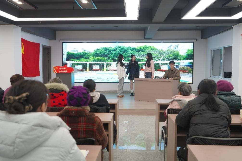 活动以《小院里的“新约定”》开篇,徐子牧、胡欣、张梦雪和戴文倩同学出演,通过邻里互助、共建家园的暖心场景,生动展现基层治理的温度与力量,让在场人员深刻体会“从群众中来,到群众中去”的工作理念,明白党的事业离不开群众的支持与参与。