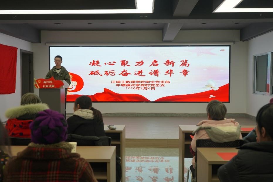 冬日暖阳映初心,砥砺奋进正当时。为传承红色基因、践行初心使命,数理学院学生党支部联合牛塘镇沈家弄村委于2026年1月6日在 沈家弄村党群服务中心开展 “凝心聚力启新篇,砥砺奋进谱华章” 主题党日活动。村委工作人员、村民及学生党员共同参与,在理论学习与实践互动中感悟初心、共话担当。