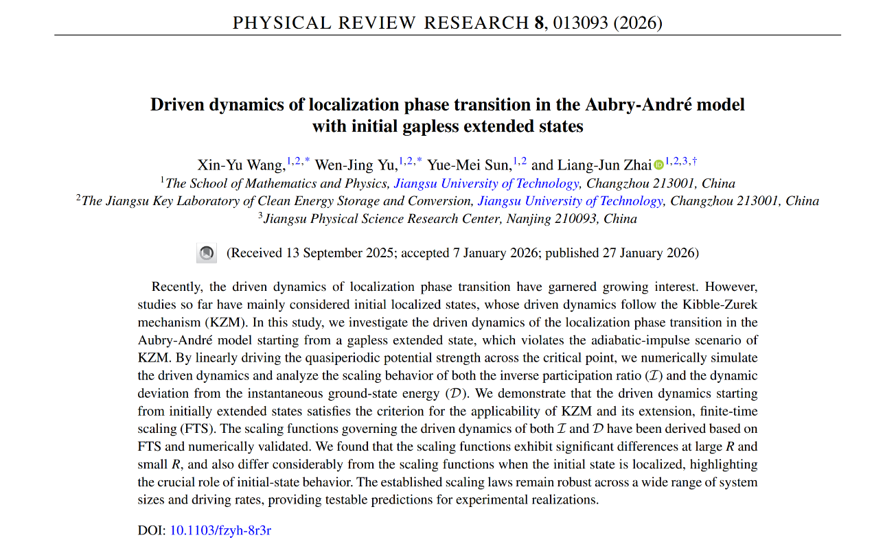 近日,我院凝聚态理论与计算团队在非平衡局域化相变的研究中取得重要进展。该团队首次系统研究了从无能隙扩展态出发的Aubry-André模型中局域化相变的驱动动力学,揭示了扩展态初态对非平衡标度行为的决定性影响,相关成果已发表于国际权威期刊《Physical Review Research》。